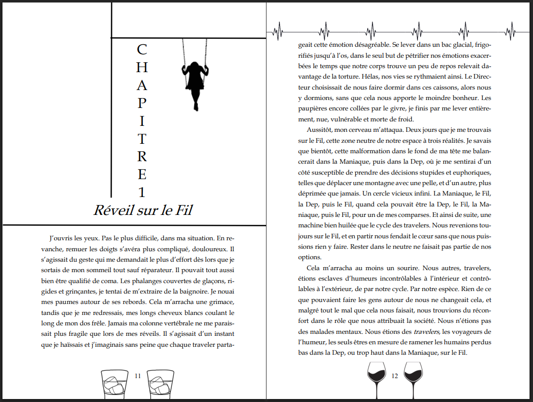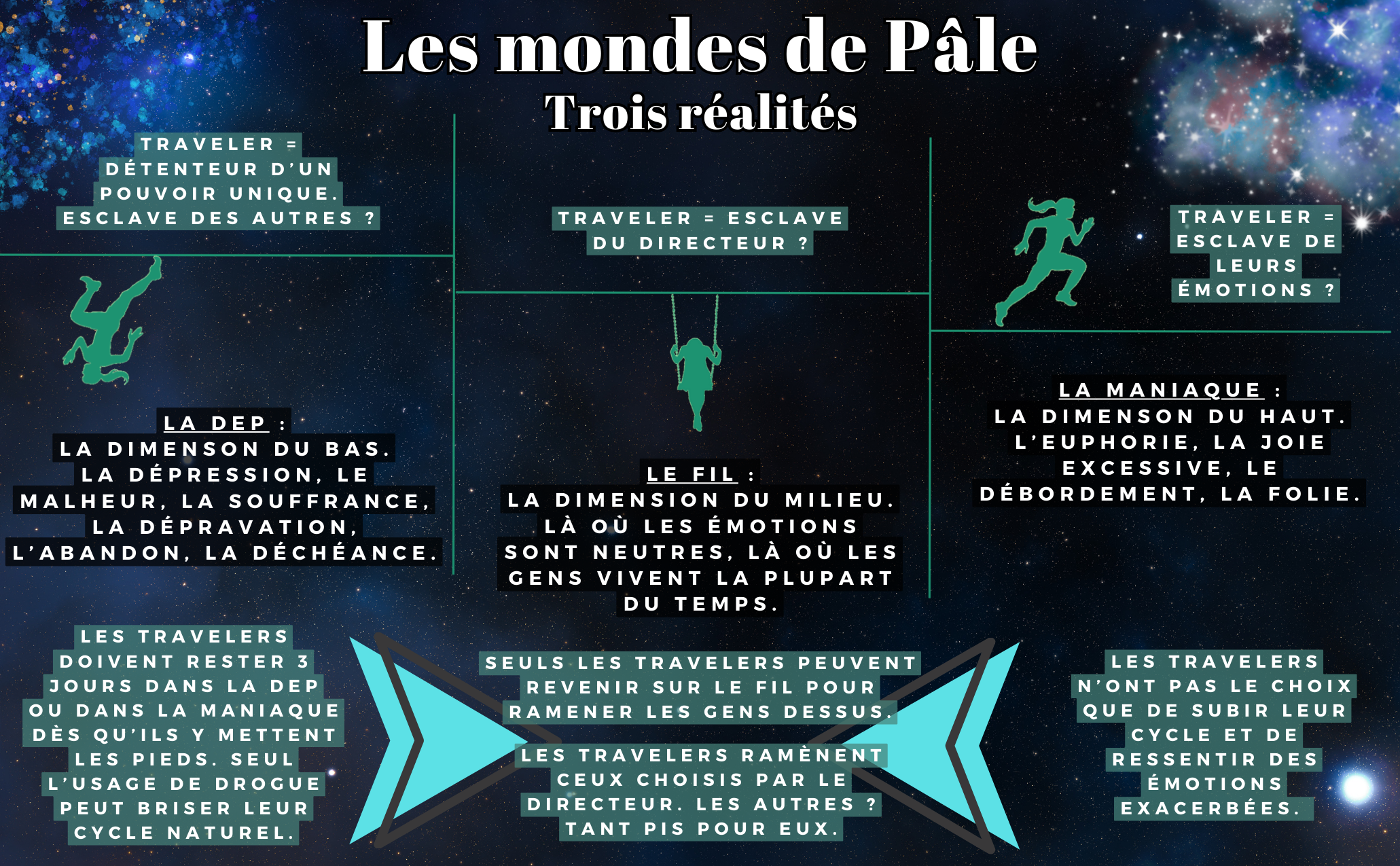 Pâle n'est pas que mon nom, il représente tout ce que je suis. Un patronyme que l'on donne à ceux de notre espèce, les travelers, en fonction de la couleur de notre peau. Certains diraient qu'on est chanceux, moi je dirais qu'on a pas le choix : la Dep, le Fil, la Maniaque, ou la Maniaque, le Fil, la Dep... Un cycle obligatoire par-delà les trois dimensions pour nous qui subissons nos humeurs exacerbées. Euphorie dans la Maniaque, envie de se buter dans la Dep… La routine.