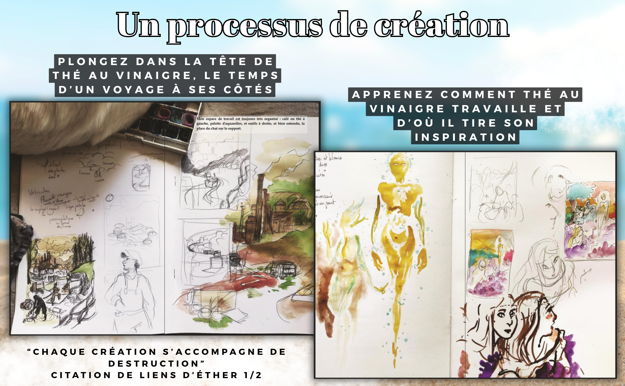 Mais l’artbook, ce n’est pas que ça : c’est aussi des informations supplémentaires sur l’univers, et croyez-moi, le worldbuilding de Chloé est colossal (un vrai bijou de richesse et de cohérence). On y trouve aussi des extraits du roman qui, je vous préviens, vont vous donner une irrépressible envie de craquer pour le lire si ce n’est pas déjà fait. Et la petite cerise sur le gâteau ? La découverte du processus créatif de Thé au Vinaigre. Entre croquis, étapes et réflexions, on comprend mieux l’ampleur du travail et c’est absolument fascinant.