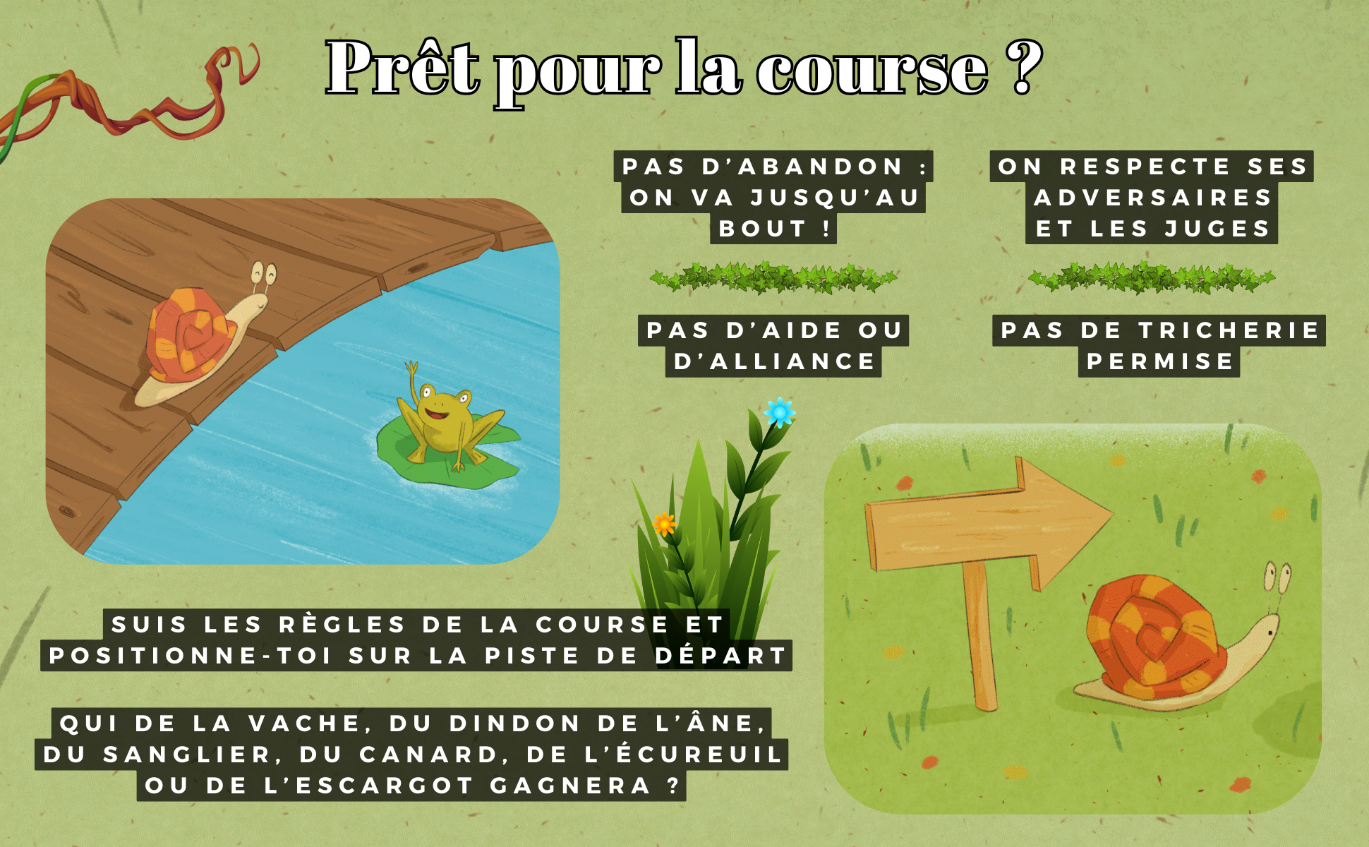 C’est décidé, cette année, Salto l’escargot va participer au cross des animaux de la forêt du grand chêne.