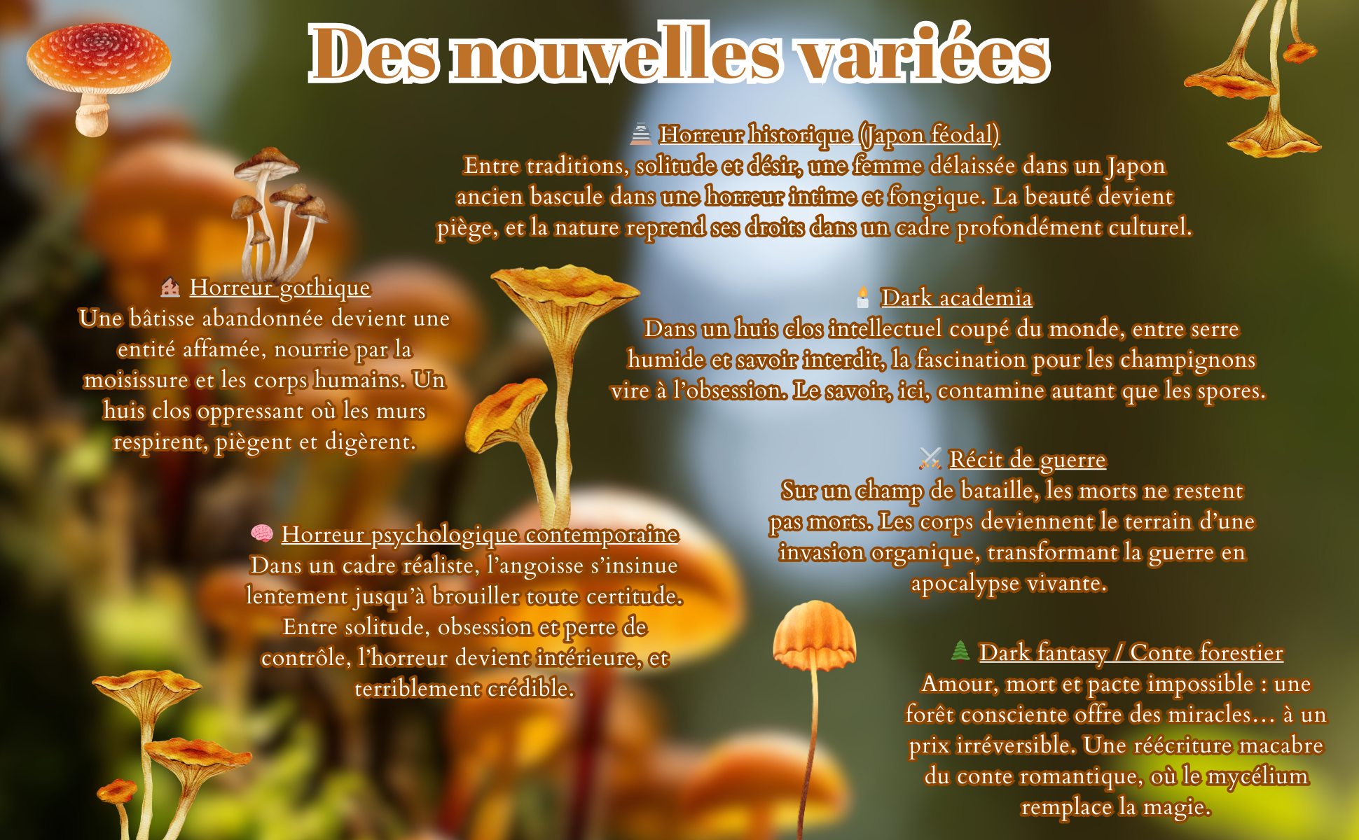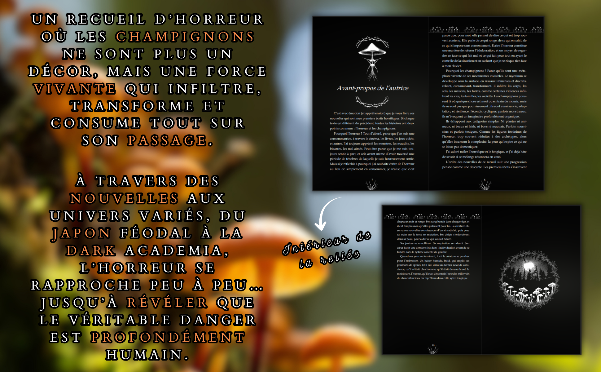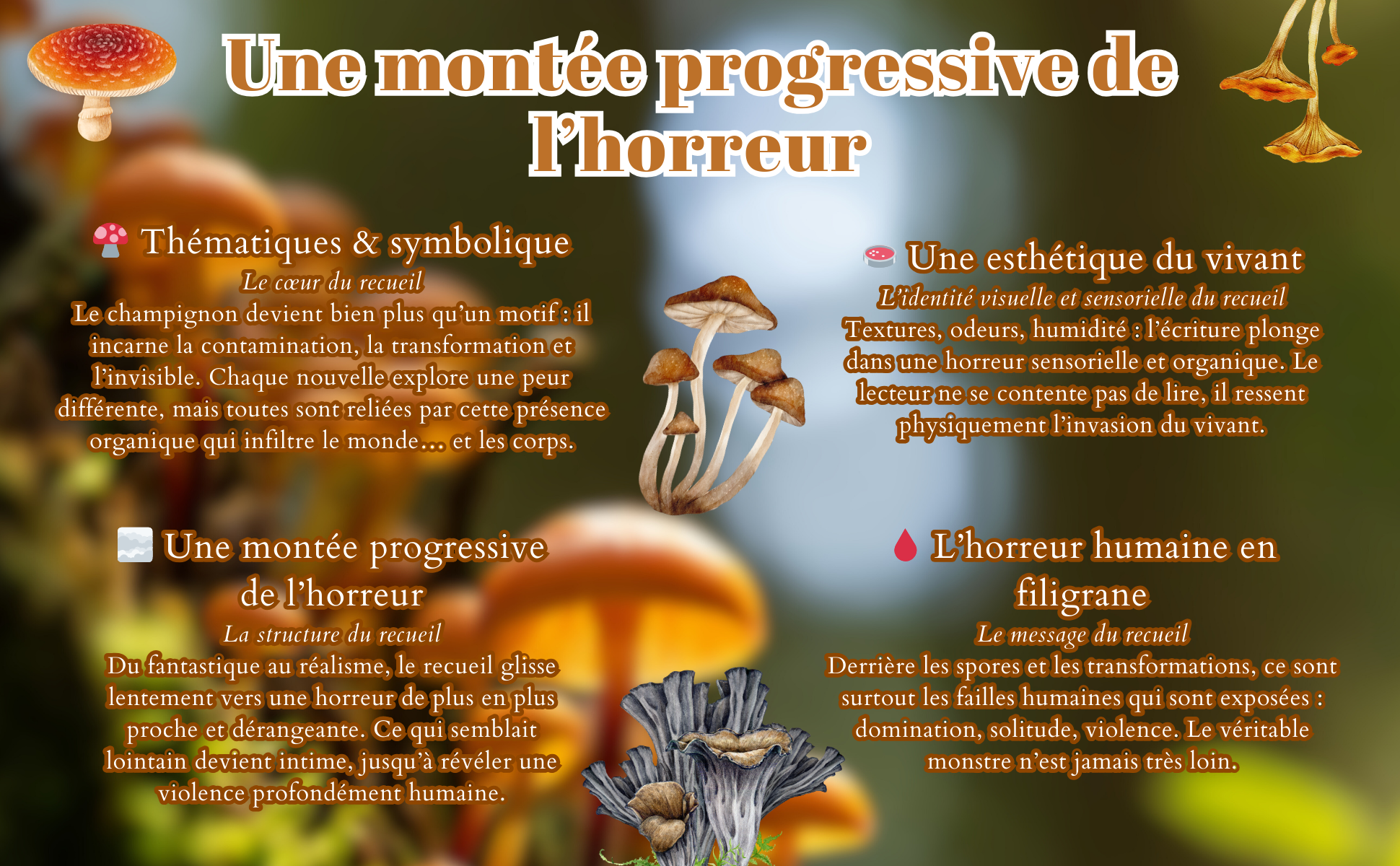 Dans ces nouvelles horrifiques, forêts, maisons abandonnées, gouffres, villages et lieux du quotidien deviennent le théâtre d’une contamination lente et inexorable. Les spores flottent dans l’air comme une promesse, ou une menace. Elles séduisent, transforment, colonisent. Ceux qui les respirent découvrent trop tard que le monde fongique ne se contente pas de décomposer la mort : il façonne aussi de nouvelles formes d’existence.