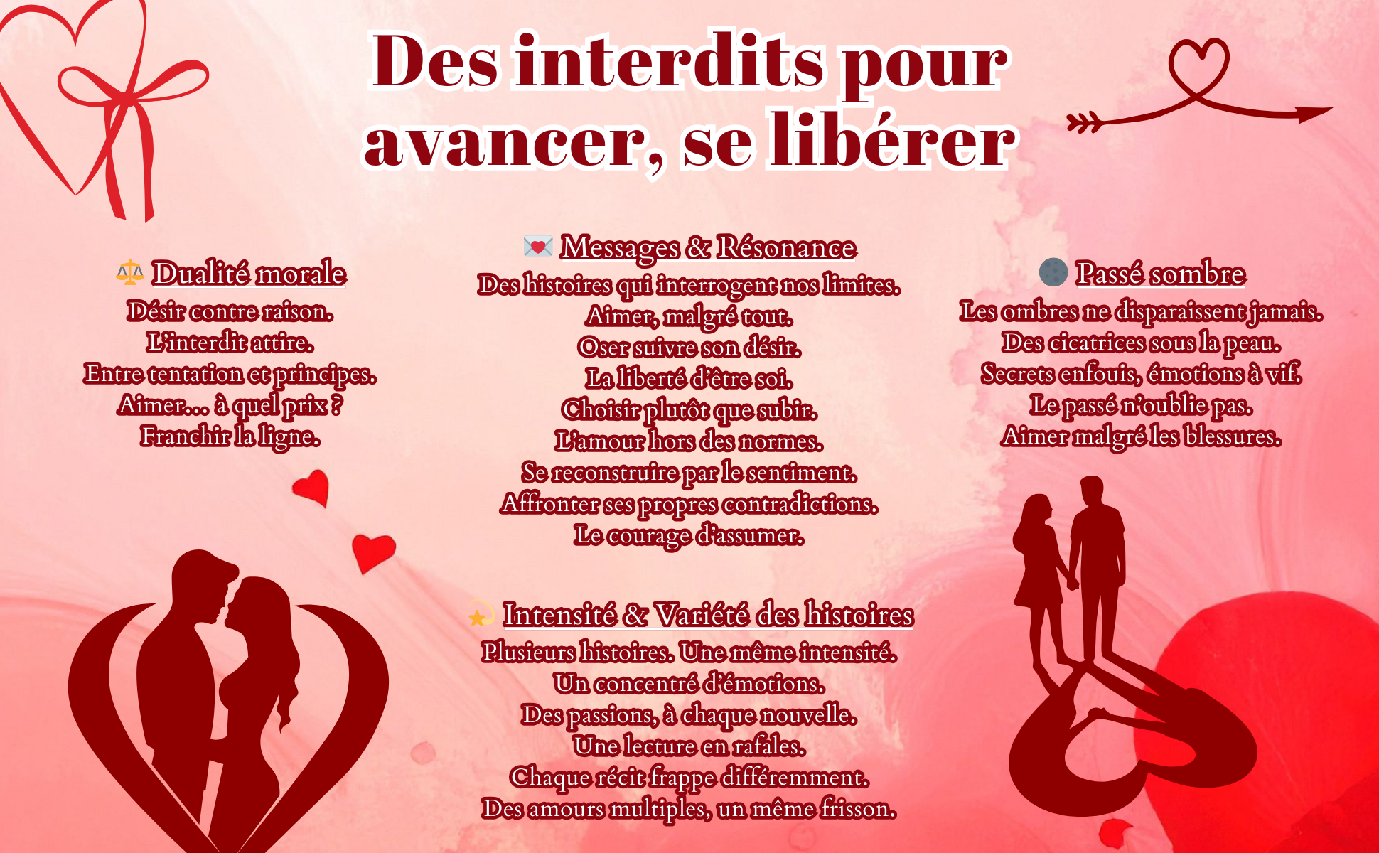 Dans Les délices de l’interdit, chaque nouvelle explore un fantasme, une frontière, un frisson que l’on n’ose pas toujours nommer. Entre adultères murmurés, jeux de séduction, penchants inavoués et élans de liberté, ces récits tissent une cartographie intime du désir. La plume se fait tour à tour caresse et vertige, toujours en poésie, toujours en légèreté.